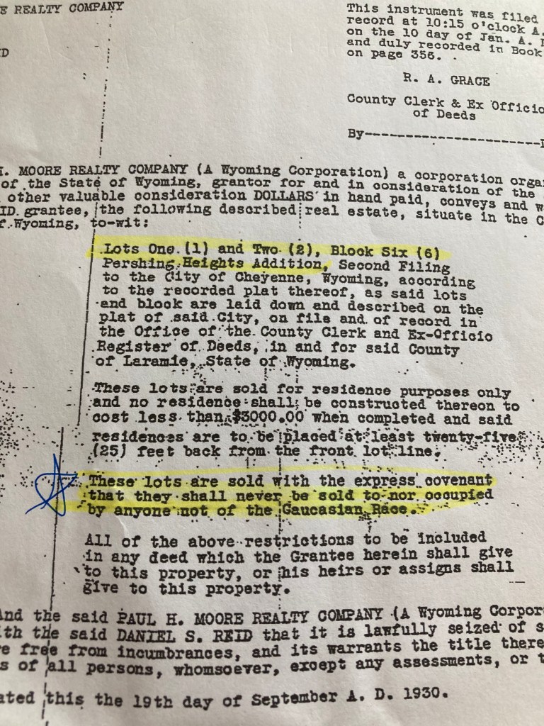 Let’s talk for a moment about Racially Restrictive Covenants (RRC). Rewind 5 years ago to when my wife and I were in transition from Laramie to Cheyenne. We’ve always been drawn to historic homes and we knew the second we stepped foot in this home we were going to buy it. It’s not the first old home I’ve bought. But, turns out, it was the first to have a racially restrictive covenant.